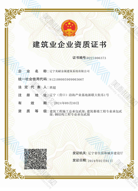 遼寧美耐金屬建筑系統(tǒng)有限公司位于遼寧(營(yíng)口)沿海產(chǎn)業(yè)基地,專(zhuān)注于預(yù)制金屬建筑系統(tǒng)領(lǐng)域,是一家集工業(yè)建筑設(shè)計(jì)、制作、施工及相關(guān)的技術(shù)咨詢(xún)與服務(wù)為一體的綜合性服務(wù)企業(yè)。作為國(guó)家鋼結(jié)構(gòu)協(xié)會(huì)會(huì)員、中國(guó)建筑金屬結(jié)構(gòu)協(xié)會(huì)會(huì)員單位與國(guó)家高新技術(shù)企業(yè),美耐建筑集建筑工程施工總承包、鋼結(jié)構(gòu)工程專(zhuān)業(yè)承包等多種資質(zhì)于一身,并擁有22項(xiàng)鋼結(jié)構(gòu)建筑領(lǐng)域?qū)@?項(xiàng)軟件著作權(quán)。